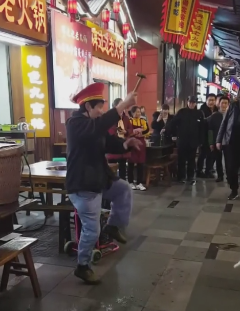 大叔跳骑马舞跳得十分投入,舞姿销魂,霸气四射。骑马舞怎么能没有马呢?大叔将一个铁锤举在胸前,随着音乐节奏不停变换动作。