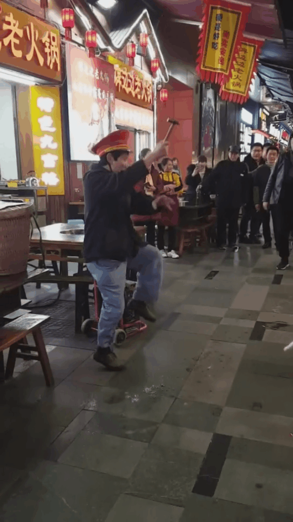 大叔举铁锤跳骑马舞 舞姿销魂引围观