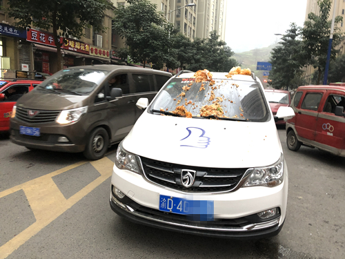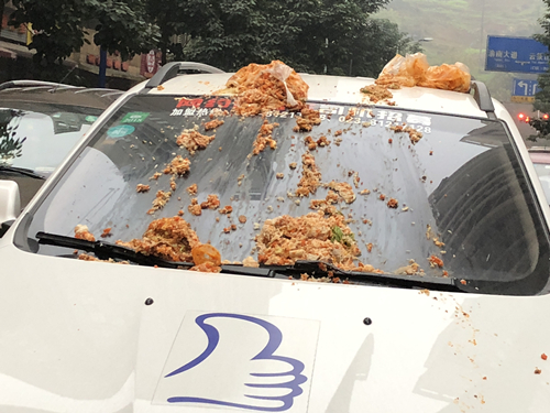 “天降炒饭”砸中轿车 引擎盖上还有点赞图案