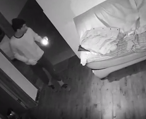 监控显示,2018年1月7日晚上8点十几分的时候,小偷就打着手机电筒鬼鬼祟祟的进入房间。这个小偷看起来约二十几岁左右,戴着口罩,看不清脸。刚开始进入房间的时候还畏手畏脚的,小心翼翼的走路,甚至为了不让人发现脚步声,还趴在地上行走。
