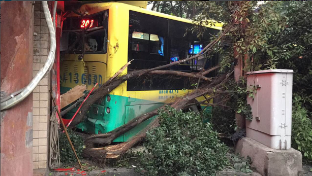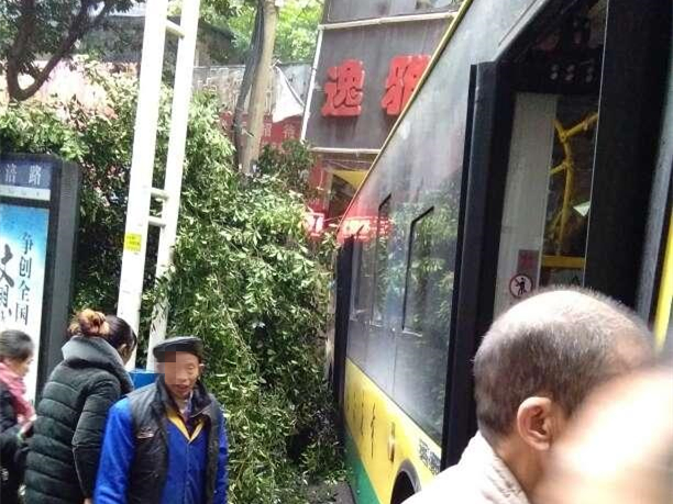 公交车车尾受到剧烈撞击,车壳多处损毁,巨大的冲击力将门市旁的树木撞断,枝叶散落一地,现场一片狼藉。