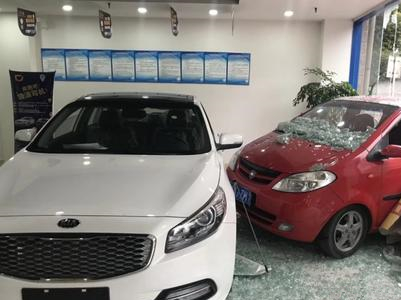 一辆红色长安车破门而入,直接冲进了汽车店里,玻璃门被撞碎一地,汽车店内展示着的一辆起亚新车无辜躺枪,被撞得稀巴烂,现场一片狼藉。