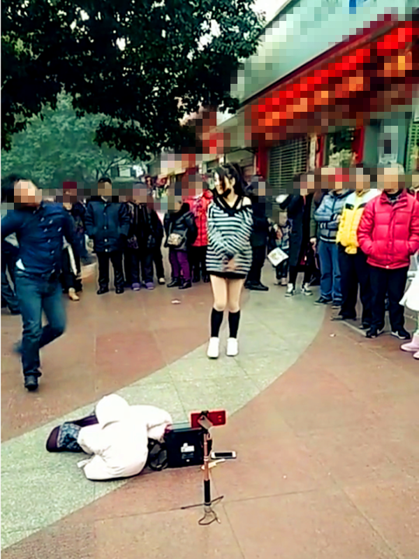 引来不少市民围观,很多市民殾围出了一个圈,将妹子与男子一起围在了圈内,大家都穿着棉袄长裤,还将手揣在棉衣里面躲避着寒冷。