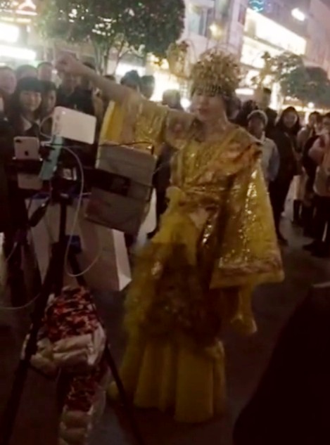 发布时间:2018-01-22 15:06:39人群中,一位打扮隆重,金光闪闪的户外主播十分引人注目。晃眼一看,犹如“娘娘”驾到,“娘娘”头戴凤冠披穿薄纱,全身散发着珠光宝气异常雍容华贵。