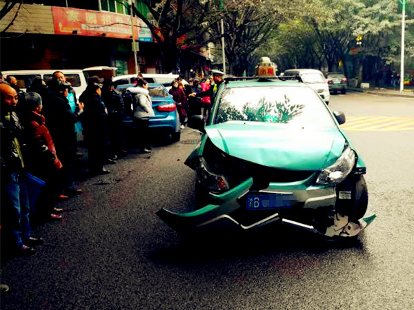 出租车十字路口吻上私家车 车头碎裂一地