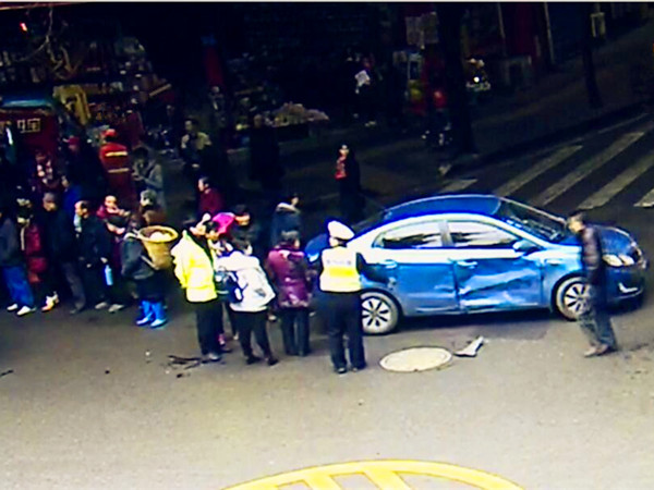 2018年1月16日,在重庆长寿骑鞍街兴学园路口,一辆蓝色私家车和一辆出租车发生碰撞,双双停在了十字路口的中央。