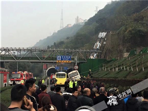 渝中区华村隧道口一辆装载32人的大巴车发生侧翻,消防官兵在现场开展救援。
