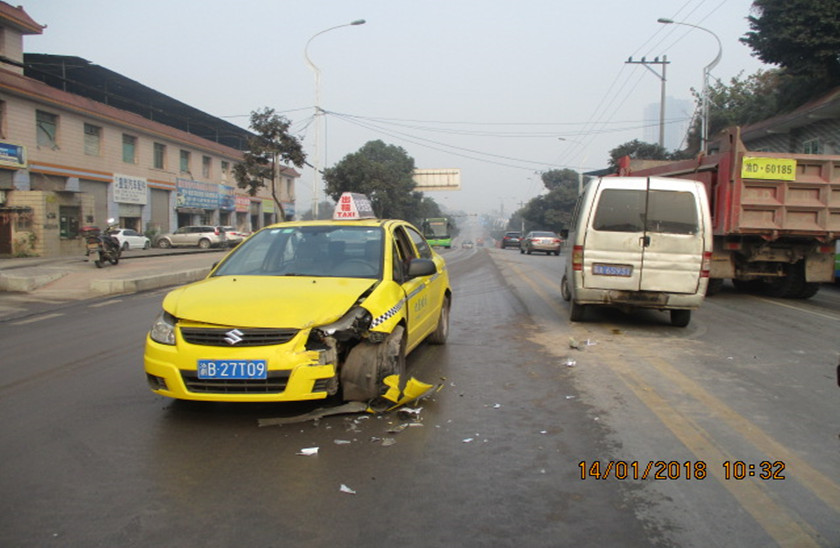 1月14日10时许,大渡口区公安分局交巡警支队民警接到报警:袁茄路刘家坝路段,一辆长安面包车在双实线处转弯时与一辆直行出租车发生碰撞,致双方车辆不同程度受损。