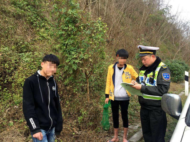 1月22日下午14时45分左右,重庆高速执法五支队六大队执法人员巡逻至三环高速铜合段上行6km+500m处,发现应急车道内有两少年提着渔网袋,正在高速公路的边坡水沟里不断张望,执法人员立即下车进行查看。
