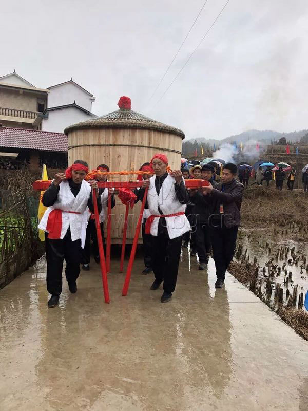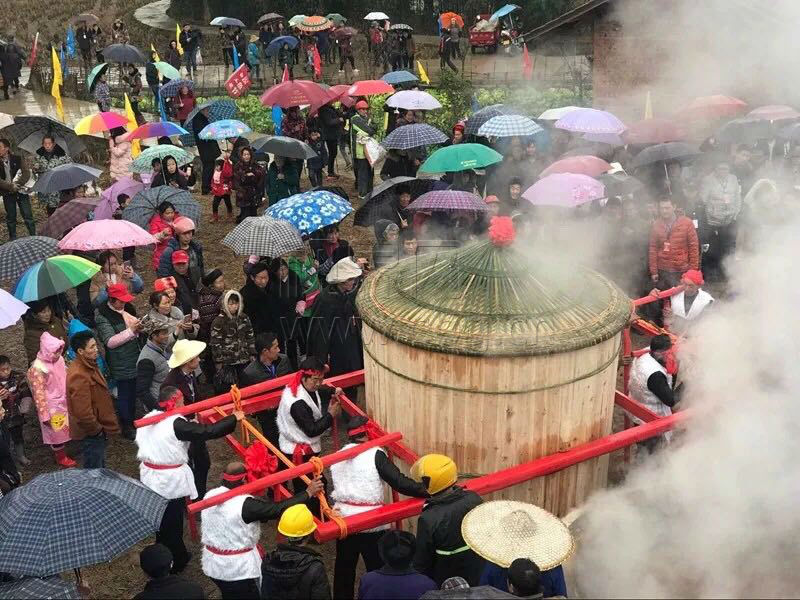 在上午的万州第一甑开甑仪式上,一个重达1000多斤,高2米,直径2米的甑子引来众人围观。举办完开甑仪式后,由8名壮年男子,头系土家帕,身穿土家袿,脚穿土家鞋,口喊土家号子,抬至就餐现场,500多人共同享用了这热腾腾香喷喷的白土高山大米。(来源:视界网)