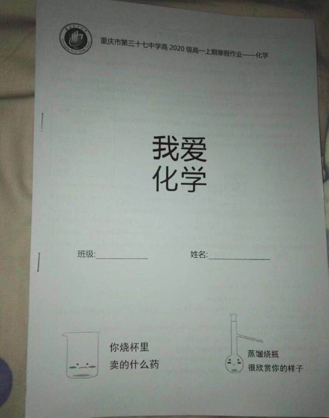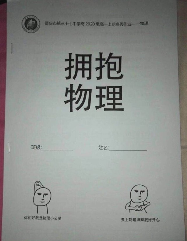 发布时间:2018-02-01 12:00:26昨天,一组重庆三十七中学的寒假作业练习本走红,不同科目的作业本上打的封面都不一样,“爱语文爱生活”“我爱化学”“拥抱物理”……别人家的老师真的不是段子手吗?