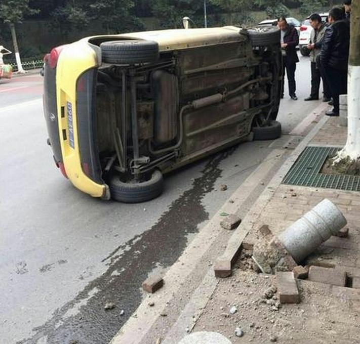 一辆轿车侧翻在路面上,油箱里的油漏出后,地面有明显的油迹。而在一旁的人行横道上,水泥柱也瘫倒在地,泥土碎渣和砖头散落一地。