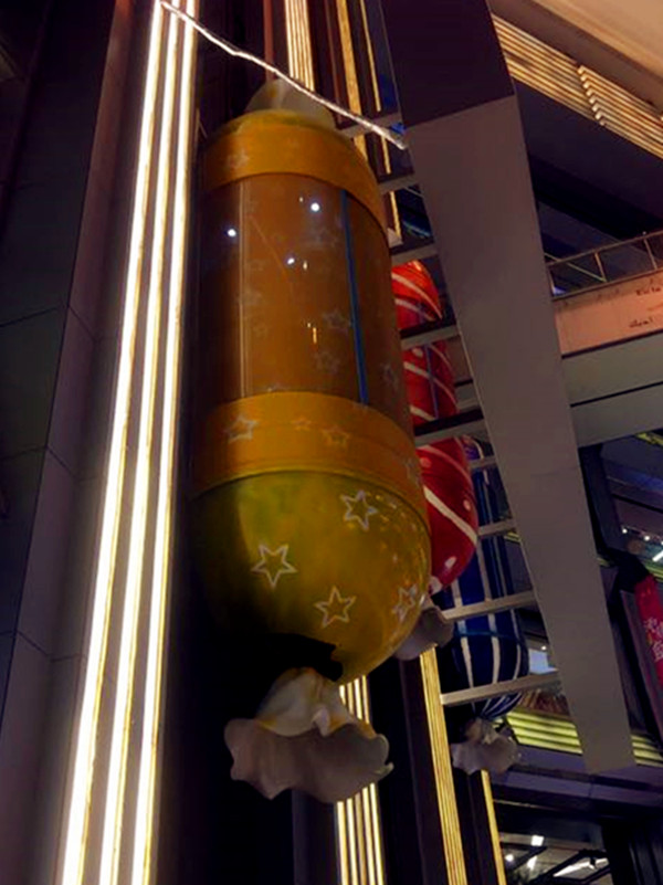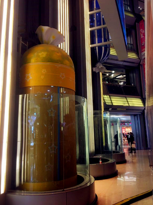 这里有三个观光电梯,供来到商场的顾客上下楼层使用,分别是黄、红、蓝三个主色,每个外壳上还装点有不同的纹路,黄色轿厢外壳上点缀的是五角星,红色轿厢外壳上点缀的是横条纹,蓝色轿厢外壳上点缀的是竖条纹。