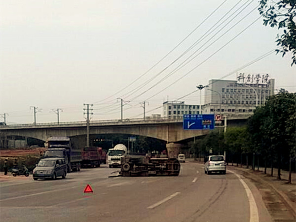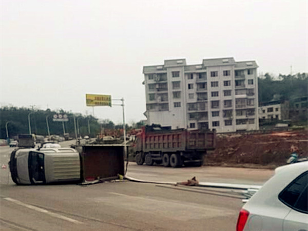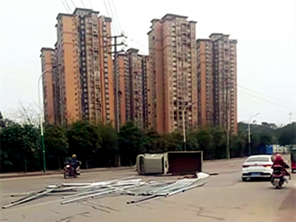 长安车侧翻横停路中央 建材散落一地