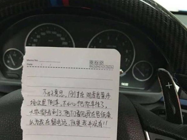 宝马车主见自己的爱车受伤后,十分心疼。可现场并没有见到肇事者,正准备报警的时候,宝马车主发现了自己爱车前面的挡风玻璃墙上有一张纸条。这暴怒的情绪一下子被这张“纸条”给抚平了。主动认错,可以加分。