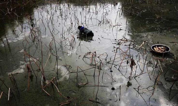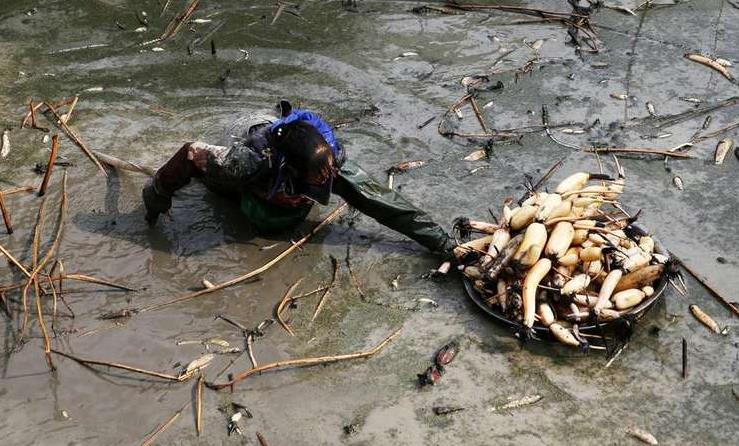 重庆女工冰水中挖藕 每天挖得比男工还多