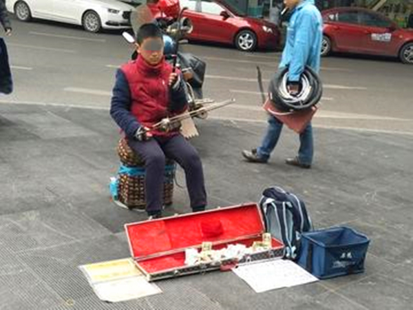 小男孩街头拉二胡挣学费 有人支持有人怀疑