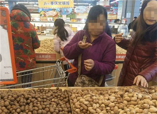 有的顾客抓起一把花生或瓜子后也不买,直接在超市里边吃边悠闲的逛。