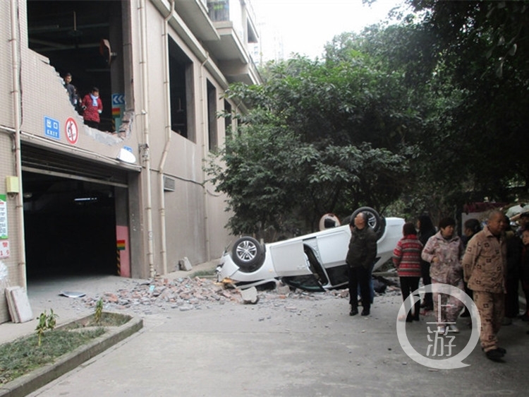 当天中午12时许,南岸区交巡警支队南坪大队接警后立即赶到现场,只见一辆白色雪佛兰轿车仰躺在车库出入口附近,车损严重,周围全是散落的砖块,车库二楼有较大缺口,两名受伤人员正在接受医护人员急救。