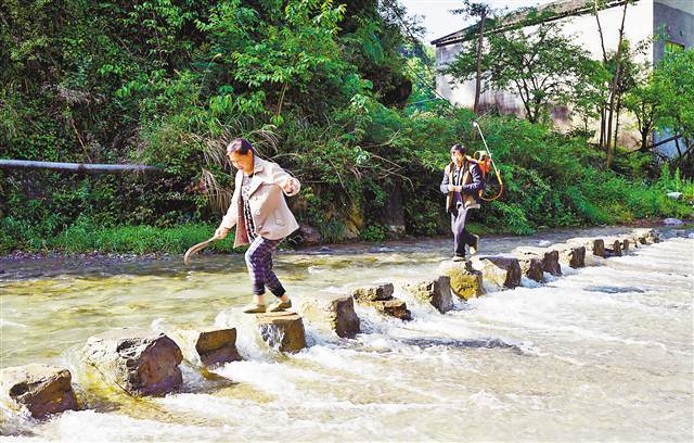 修桥前,村民靠铺在河面上的一块块垫脚石过河。