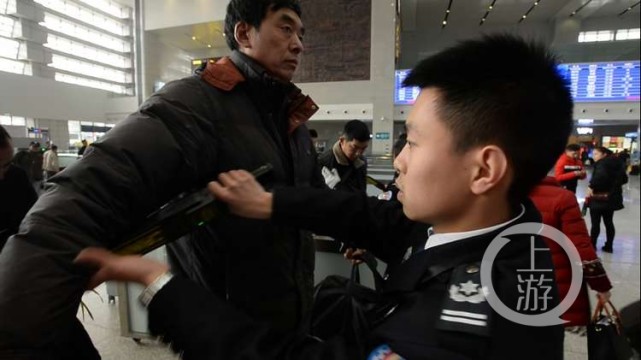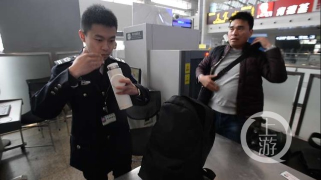 △目前火车站还没有装检查液体的装置,乘客行李包里有水的,必须拿出来检查,有时喊旅客喝一口,有时安检员会打开闻一闻。