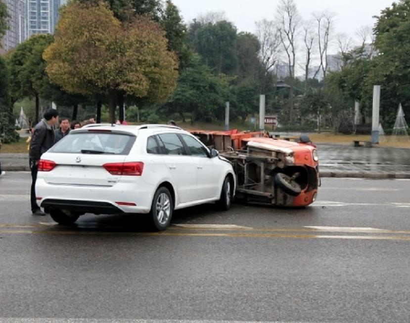 侧翻在地的三轮和白色小轿车,停在道路中间,周围站了不少围观市民。大家议论纷纷,有现场目击者介绍,当时两车均为同向行驶,轿车突然减速,在后面行驶的三轮准备从轿车左侧超车,谁知轿车司机没有注意到正在超车的三轮,方向盘往左一个掉头,结果将三轮车当场顶翻在地,由于惯性左右,两车滑行一段距离后,最终在对向车道上才停了下来。