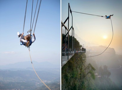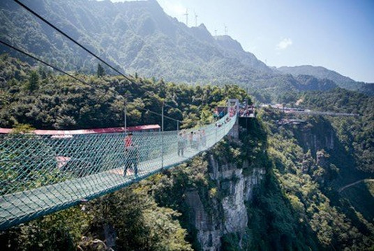 在体验云端廊桥和高空漫步的时候,你也随时可以看到有游客排队等候体验极限飞跃或者步步惊心。100层楼高的高空,在间距0.8米-2.5米不等的平台之间高空跳远,你是哆哆嗦嗦还是大踏步跳跃呢?如果去掉你背上的绳索,你还敢跳吗?在挑战胆量的同时,亦让人完美体验美丽崖景和瀑布飞流直下的震撼场景。当然,如果你是恐高症患者或者身高不足1.4米的儿童,你可以在这里为父母加油打气。极限飞跃,也是对勇气的挑战。