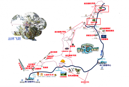 高空项目的最后一站——丛林飞跃,两颗树之间的通道都不一样,就像是是打怪一样,一旦开始就不能退回。丛林飞跃也专门设有适合亲子体验的线路,所以如果不想让孩子错过丛林飞跃体验的,一定要提早规划时间,奥陶纪所有的排队项目所需要的时间大约在1—2个小时左右。同时,在高空项目之间,也有诸如石林迷宫、将军石、寒冰洞等奇特卡斯特地貌景点,也是值得前去游玩一番的。