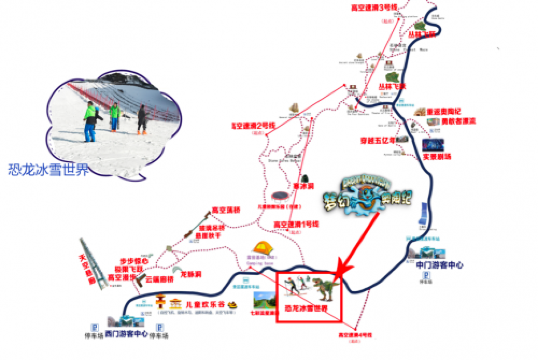 小编从奥陶纪公园了解到,从开园至今,随着新增项目陆续建成并对外开放,公园内项目不断提档升级,实行180元/人的通票制度,现一张游乐票不仅可以滑雪、玩雪,还可以畅游十大高空项目以及亲子游的滑草、儿童欢乐谷、科幻梦工厂等所有项目。所以,要进入公园开始一天的行程,你只需在公园大门旁的售票处买一张180元的游乐票即可,同时1.2米—1.4米的儿童可享受120元/人的优惠票价,1.2米以下的儿童则可享受免票。进入公园,你有两条游玩线路可选择,一条是从恐龙冰雪世界—儿童欢乐谷—十大高空项目—科幻梦工厂结束,另一条线路则相反。按照这两条线路来游玩可以相对节省时间,也可以很好的把所有项目和公园景点串联起来。今天这份寒假攻略就选择从冰雪世界开始。
