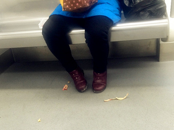 爆料市民说,这名女子一边削了皮一边往车厢地上扔,而且吃到了苹果核也往地面上吐,这样的举止令其他乘客十分不满,也有人说她这样没素质,但显然这名女子没有感觉,一直自顾自地吃着苹果,削着果皮。