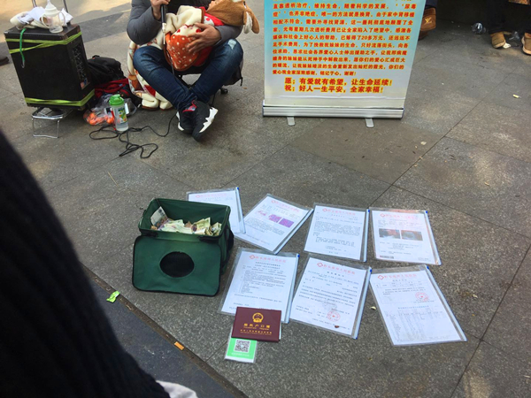男子旁边立着一个展板,上面写着乞讨原因,上面介绍这个被抱在怀中的娃娃是该男子的妹妹,患上了尿毒症,急需救援,希望人们献出爱心,救救这个年幼的孩子。