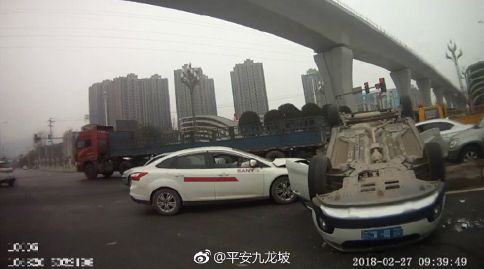来自平安九龙坡官微的消息:2月27日早上,华龙大道美每家路口发生一起两车相撞的交通事故,一辆白色起亚轿车在行驶致路口时,无视交通信号灯指示,撞上正常直行的白色福克斯轿车,由于车速过快,起亚轿车当场被撞翻,福克斯轿车也受损严重。