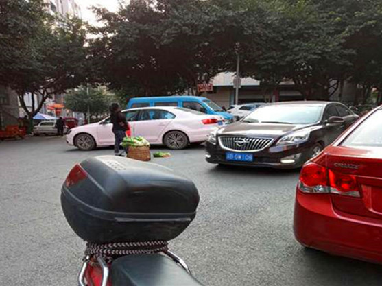 过往的车辆、行人络绎不绝,中年女子依旧不动摇,来往的司机对这样全然不顾个人安危的售卖方式,不由得也捏了一把汗。