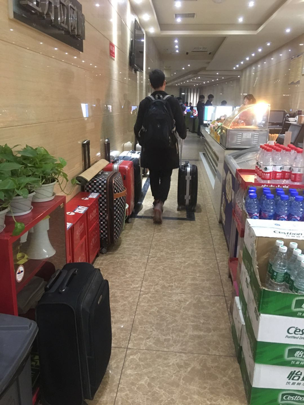 一排排五颜六色、形状各异的行李箱,在网吧大门口排起了长龙,十分壮观。