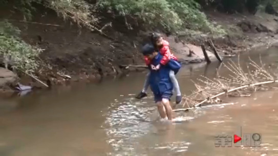 桥被洪水冲垮 家长只能背着孩子蹚水过河去上学