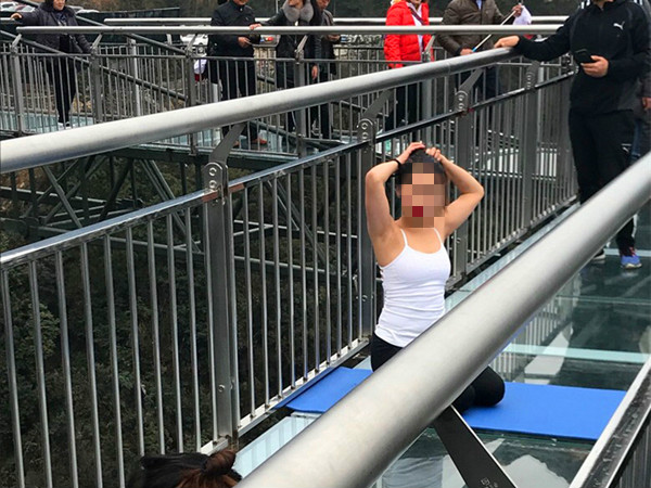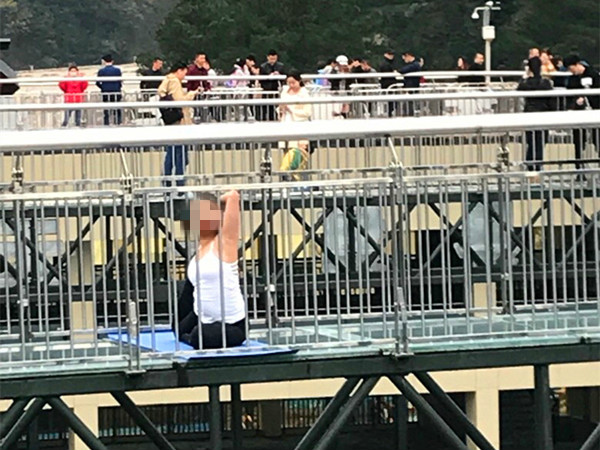 周围人满为患,本就狭窄的玻璃栈道,一下子就被瑜伽女子给堵死了。有想看热闹的游客,在女子旁边拿起手机拍照。