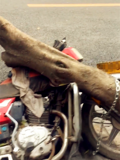 车主将摩托锁在树上 结果树倒了