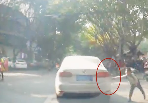 报料市民说,当时正是放学的高峰期,学校门口车水马龙。一位背着书包,看着约六七岁的小男孩站在路边,看到有一辆白色私家车缓缓驶来,就将手伸长,触摸过路车辆。