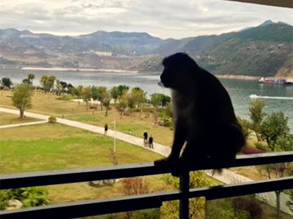 网友带着好奇心,走到阳台处,发现竟是一只“美猴王”,不知是迷路还是怎么的,跑到酒店客房阳台上来了,姿态呆萌十分搞笑。