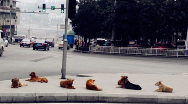 道路上车水马龙,人潮涌动,可是狗狗们仿佛什么都感觉不到,依旧悠闲地躺在红绿灯路沿处,十分惬意。