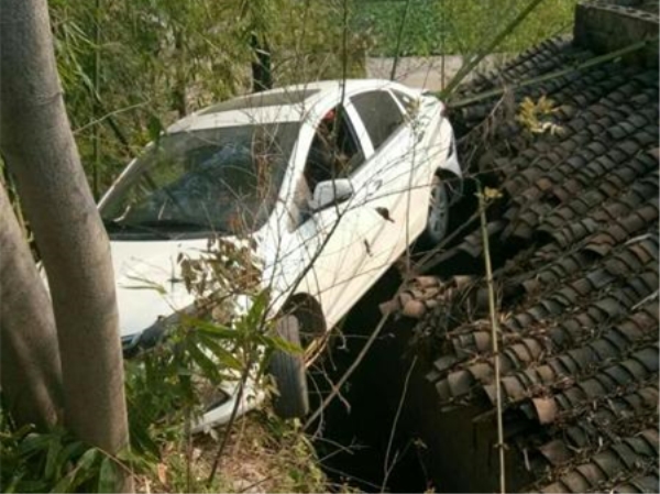 轿车开上瓦房屋顶 悬半空中很惊险