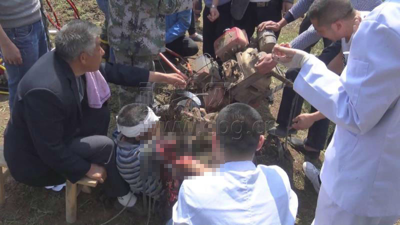 消防人员赶到现场时,老人正坐在地上,面色煞白,浑身是血,他的右手手臂几乎完全断裂,左腿被卷入到微型旋耕机的旋转轮里,动弹不得。