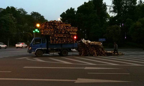 通过现场图片我们可以看到,货车货高和货长均超出原车一倍多,货物堆积如山,密密麻麻重重叠叠,即使地上掉了一大堆木箱后,车上还有如此多的木箱,这样高超的装载技术着实让人眼前一惊。