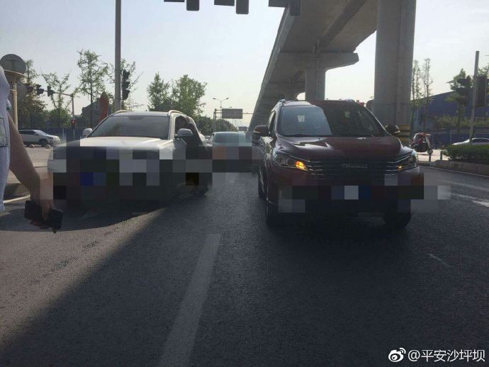 来自平安沙坪坝官微的消息:近日,刘某驾驶小轿车行至大学城轻轨站附近时,因低头看微信走错了道,情急之下打错方向盘,与右边车道的白色轿车发生擦挂。