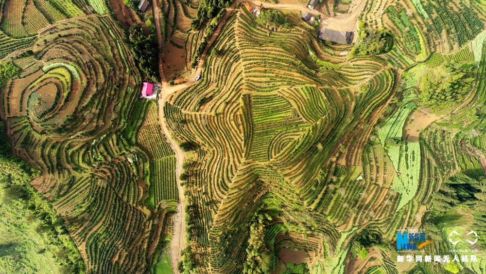 近年来,宜居乡利用山高谷深、终年云雾缭绕的独特地理和自然环境,发展万亩茶叶增收致富。图为无人机航拍云雾山中宜居茶。