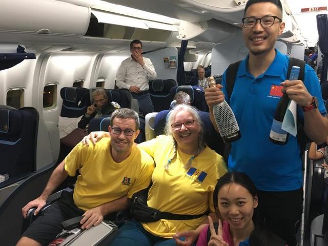 该乘客和家属向医疗队队员竖起了大拇指。全体机组成员也对医疗队队员表达了最崇高的敬意,并赠送了两瓶香槟表示真诚感谢。
