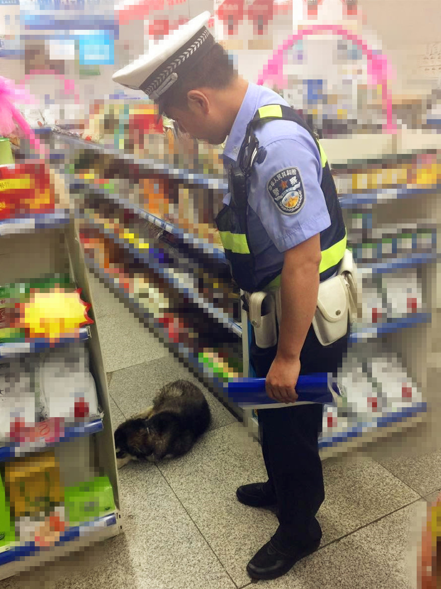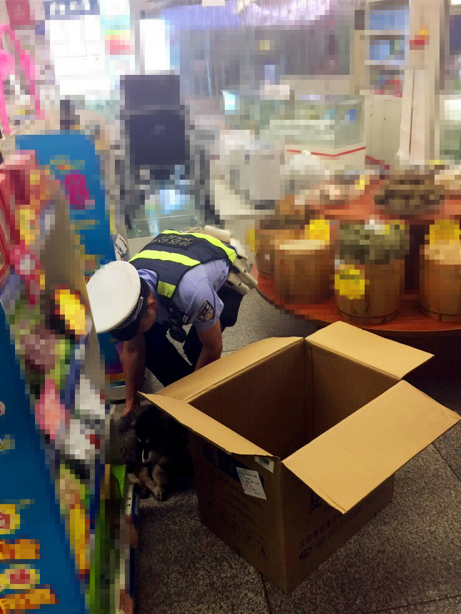 民警给它应该是热坏了,喂了口水后精神好了许多,为了不影响店里的生意,民警将其放进一个纸箱,带离了药店。