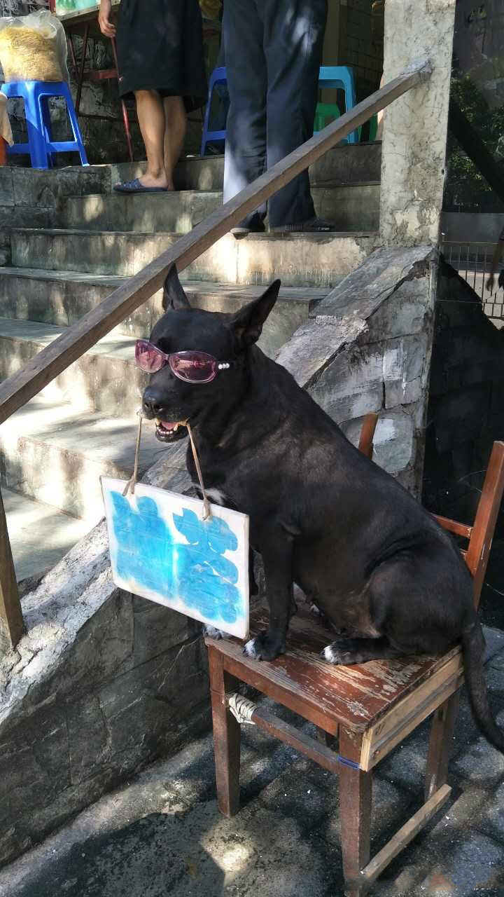 重庆街头现萌犬 戴墨镜叼招牌帮主人揽生意