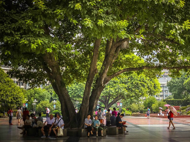 重庆这座山城的绿化率是很高的,在各大商圈、住宅区都有公园。阳光被密密麻麻的绿树挡住,坐在树荫下,吹着自然的风,也是清凉了不少。