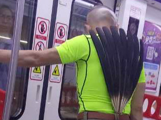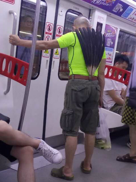 男子背插羽毛扇上轻轨 霸气十足